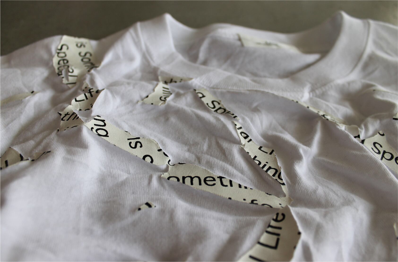 Tシャツをランダムにくしゃっとたたみ、上から特殊なプリントを長方形に配した。